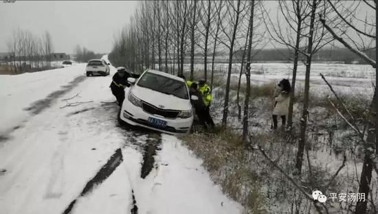 2月10日,汤阴连夜降雪造成国省道、主干道路积雪严重,汤阴县公安局做好应急管理,全力搞好恶劣天气交通管理工作。上午九时左右,汤阴县公安交通管理大队公路巡警杨红乾带领辅警元志民、吴迪、常宝星在219省道巡逻时,发现一辆轿车滑入路边沟内,几人立即停车上前查看情况,确认司机和乘坐人员并无伤亡后,杨红乾对现场情况进行堪查,并安排一名辅警在副驾驶位置加重,自己与另外两名辅警帮助车主一起推车,经过半个多小时的努力,成功将车辆推上马路。