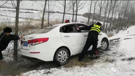 车主田先生是河北魏县人,因春节假期结束,今天从老家返回河南浚县上班。当行驶至219省道汤阴段时,因路面太滑,一不小心操作不当,滑入道路一侧沟内,几次尝试未能成功,就在此时正好碰到了在此辖区巡逻的民警。