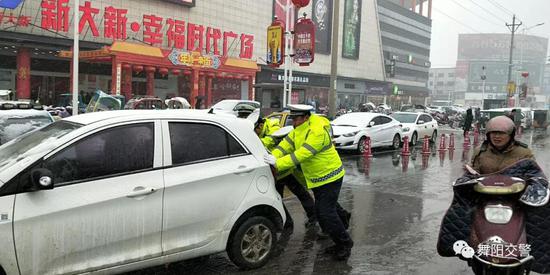 县城道路车流量大,总有车辆突然熄火,面对熄火在原地不知道怎么办的驾驶员,舞阳交警大队城区中队的民警也是忙的不可开交,在风雪中帮助多名驾驶员推车,保证道路畅通。执勤民警不畏严寒一边指挥交通,一边帮助推车的行为,感动了广大驾驶员和市民,得到了群众的一致赞扬。