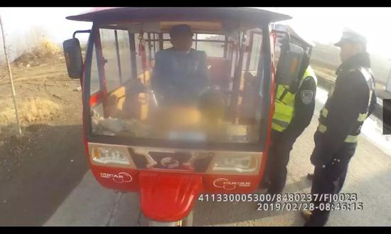 2019年2月28日,桐柏县公安局交警大队毛集中队在S206省道桐柏县毛集镇光武村路段开展重点交通违法行为整治,8时许,一辆无牌三轮摩托车沿S206省道自北向南驶来,民警发现该摩托车未悬挂号牌,便将其拦下检查。