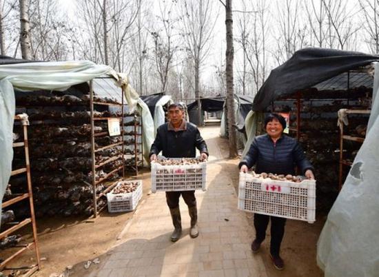 3月24日,村民在河南省民权县程庄镇林下食用菌大棚基地里忙碌。