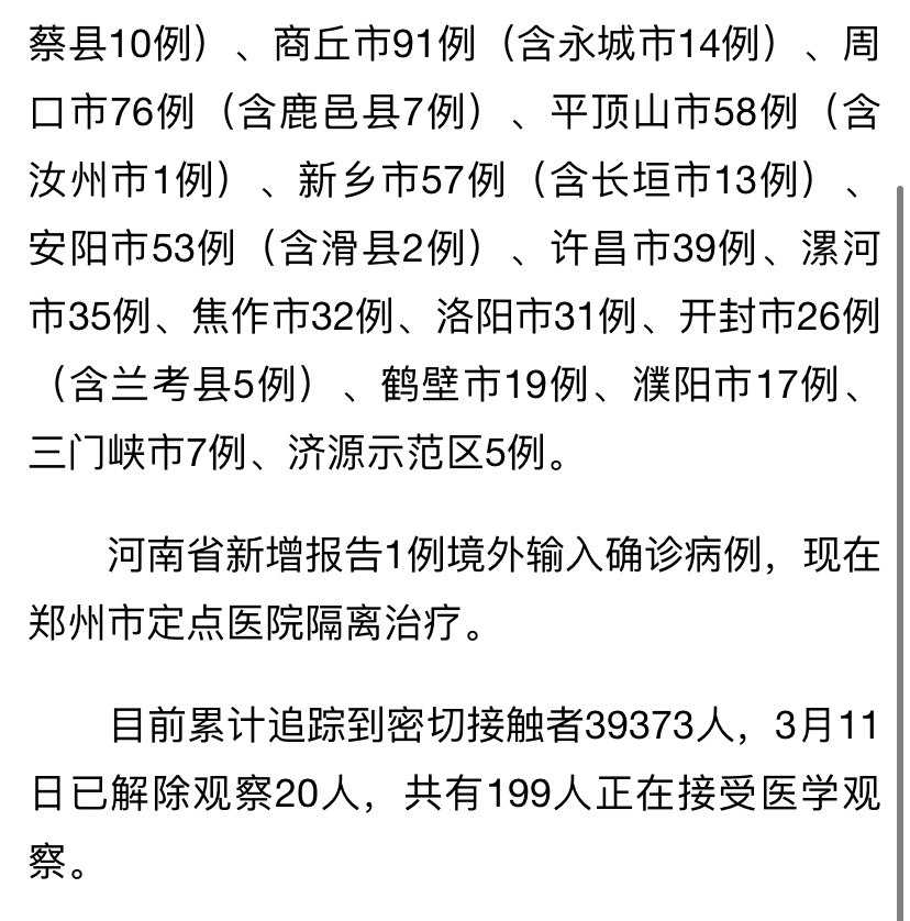 12日晚,大河报记者发现,部分自媒体出现一组数据,称郭某鹏密切接触达39373人,并由此延伸开来,进行解读。然而,据郑州市疾病预防控制中心通报,截至11日12时,经流调初步判定其密切接触者24人,一天之内,这近4万的“惊人”数字从何而来?其实,只要稍微留意查看官方发布信息就会发现,郭某鹏密切接触者39373人属于对官方发布信息的严重误读,该数字为截至目前全省累计数字,且绝大多数已解除观察,目前有199人正在接受医学观察。   大河报提醒广大网友,看到此类消息,千万莫跟风转发。 【疑问】 郑州首例境外输入确诊病例密切接触者近4万人? 《全省密切接触者达39373人!郭某鹏母亲致歉,无知不值得被原谅!》《郑州出“王炸”,密切接触者39373人!郑州这个确诊男子飞机、大巴、高铁、开学或将再推迟》《密切接触者近4万人!一个“王炸”惹怒千万郑州人!国内外行程十多次》 ……… 12日中午开始,记者发现,朋友圈里有出现一些类似的自媒体文章。从标题来看,似乎一个人的密切接触者就是39373人。这组数字从何而来?点开文章看,里面煞有其事称,该数字来自官方消息:“据河南省卫健委最新消息: 2020年3月11日0-24时,河南省无本地新增新冠肺炎确诊病例。新增报告1例境外输入确诊病例,目前累计追踪到密切接触者39373人 ,3月11日已解除观察20人,共有199人正在接受医学观察。” 【误读】 改变标点符号,将全省累计数据“移花接木”到一个人身上! 记者查询郑州市疾病预防控制中心11日关于郭某鹏正式通报了解到,截至3月11日12时,经流调初步判定密切接触者24人,均已采取集中隔离医学观察措施。   从24人到39373人,这中间悬殊实在太大。为何会出现这组数字? 12日晚,记者查询河南省卫健委3月12日上午通报消息看到:“截至3月11日24时……河南省新增报告1例境外输入确诊病例,现在郑州市定点医院隔离治疗。” “目前累计追踪到密切接触者39373人,3月11日已解除观察20人,共有199人正在接受医学观察。” 原来,某些网传自媒体稿件中将原通报中全省累计追踪到的39373人密切接触者,通过消除分段、将句号改变成逗号的方式,就“移花接木”变成了新增报告1例境外输入确诊病例的密切接触者,这种误读实在谬之千里。 如果平时注意查看官方权威通报就会了解到,全省目前累计追踪到密切接触者是每天都会通报的数据之一,比如,截至3月10日24时,全省目前累计追踪到密切接触者39263人,3月10日已解除观察24人,共有109人正在接受医学观察。 截至3月9日24时,全省目前累计追踪到密切接触者39258人,3月9日已解除观察83人,共有129人正在接受医学观察。 【提醒】 不信谣,不传谣,获取疫情防控信息一定只认“官宣” 3月12日下午,河南省政府新闻办召开河南省新冠肺炎疫情防控专题第二十八场新闻发布会,通报我省疫情防控工作最新进展,重点发布疫情防控期间的政法维稳工作情况。其中,省公安厅党委副书记、副厅长范玉龙表示,在河南新增病例连续清零的情况下,郭某鹏出国前往疫区,返回后行经多地,不如实报告来往真实情况、不按要求配合落实隔离观察措施,多次出入公共场所,多次乘坐公共交通工具,造成多人被隔离的严重后果。“一人之行为,造成一城之不安,害人害己!” 他郑重提醒:凡不按规定申报健康状况,只要确诊为新冠肺炎的,涉嫌违反《刑法》及《传染病防治法》,将被立案侦查,依法追究刑事责任。 新增的1例境外输入确诊病例,的确引发了不少市民的关注及谴责。然而,关注与谴责必须在理智的范畴内,跟风转发错误信息于事无补。在此,大河报提醒广大网友,做好防护,远离风险,同时通过官方渠道了解疫情防控进展,不信谣,不传谣,看到上述误读消息,千万莫跟风转发。 来源:大河客户端