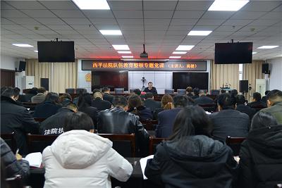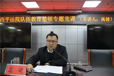 为深入推进西平县人民法院政法队伍教育整顿工作,夯实全体干警思想根基,扎实做好学习教育环节,3月18日下午,党组书记、院长高健以“党的十八大以来,习近平这样谈政法工作”为题,为全院干警上了一堂主旨鲜明、思想深刻、立意深远的专题党课。