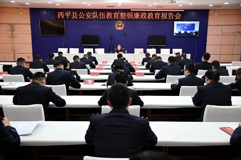 为突出学习教育环节的警示性,全面正风肃纪、反腐强警,锻造纪律作风过硬队伍,营造风清气正的创业氛围,3月29日下午,西平县公安局举办全县公安队伍教育整顿廉政教育报告会,邀请县纪委副书记、县监委副主任李世杰为大家作廉政教育报告。副县长、局党委书记、局长李新等党委班子成员、局直各单位负责人及民警代表在县局四楼会议室主会场参加报告会,看守所、拘留所、交警大队和各派出所设分会场。报告会由局党委委员朱怀骥主持。